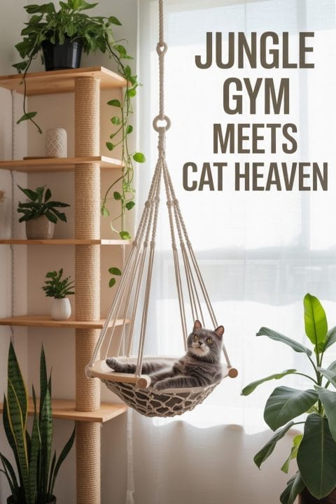 This one looks good and keeps your cat happy. Combine natural textures, greenery, and vertical levels to create a cozy indoor jungle.