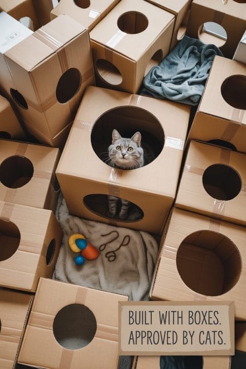 No fancy tools, no big cost—just boxes and creativity. Cats love crawling through tight spaces, so a maze of cardboard boxes is pure joy.
