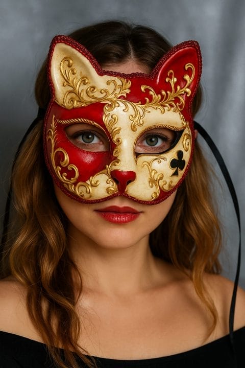 This one’s pure drama and elegance. The mask is shaped like a cat but painted like royalty. Deep red swirls with creamy gold details that almost look like icing on a fancy cake.