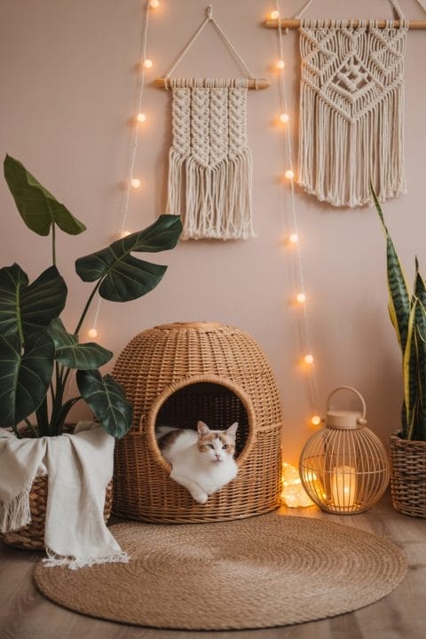If you love macramé, soft textures, and earthy tones, there’s no reason your cat can’t enjoy that vibe too. A boho-style cat room is calm, cozy, and full of personality—and you can pull it off without breaking the bank.