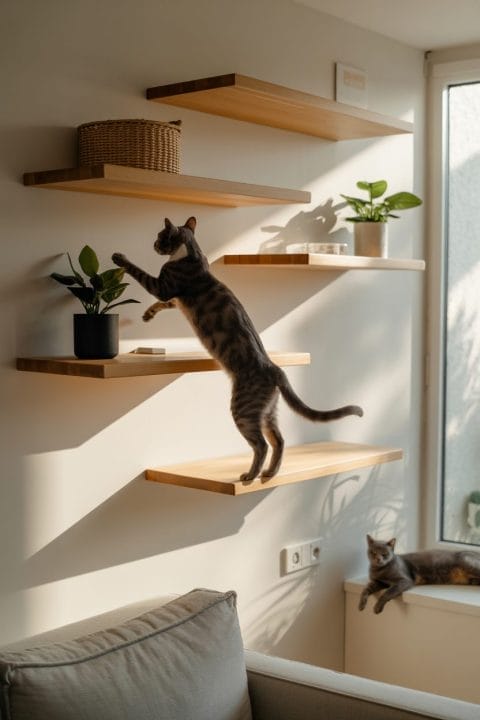These look like floating shelves but are made for cats to climb and nap on. No bulky towers. Just sleek platforms on the wall.