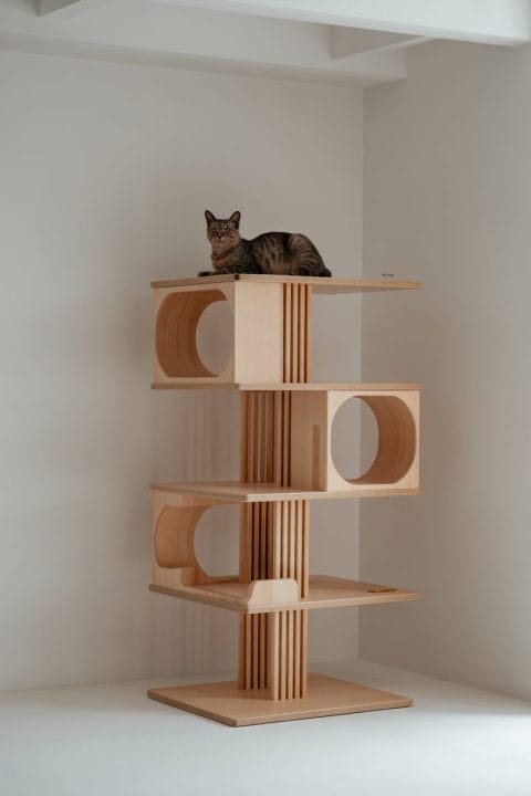 Forget those carpeted monstrosities. A modern cat tree uses clean wood, muted tones, and geometric shapes.