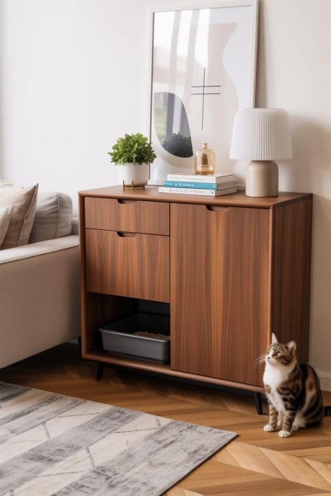 You don’t need to stare at a plastic litter pan all day. Use a litter box enclosure that looks like a real cabinet.